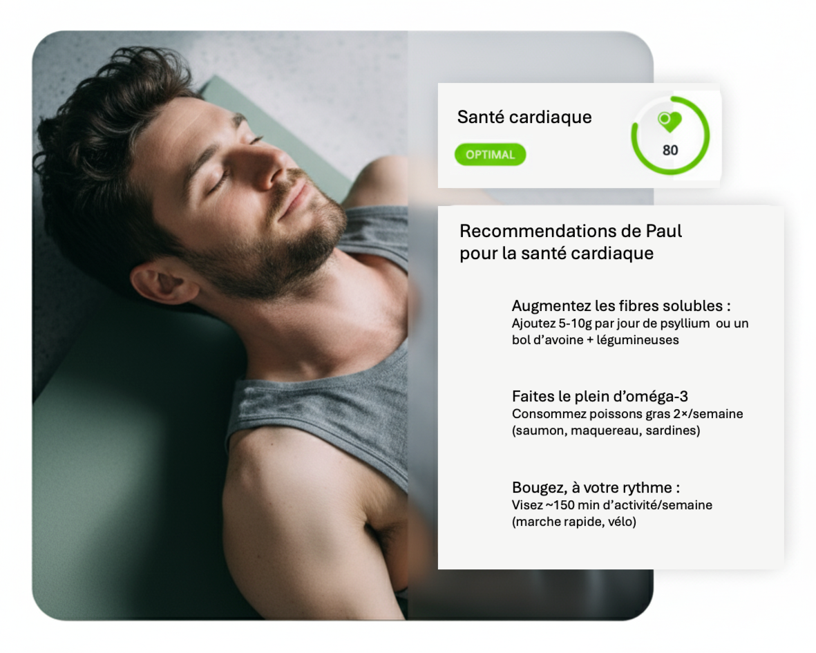 Des recommandations priorisées (alimentation, activité, sommeil, gestion du stress, supplémentation) alignées sur vos biomarqueurs hors plage et vos objectifs.