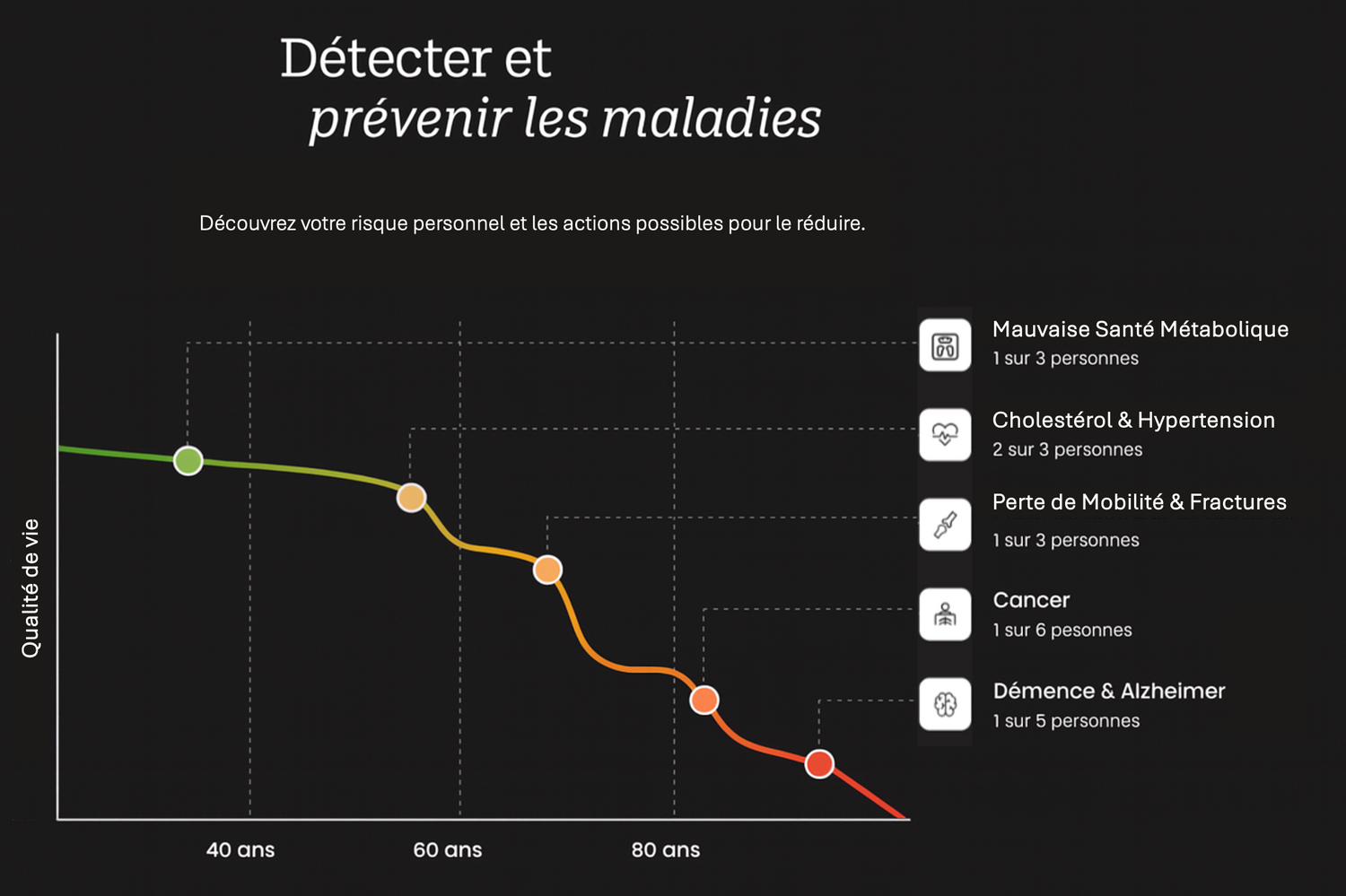 Fini les conseils génériques : aliments, compléments, exercices et habitudes réellement bénéfiques pour votre organisme. Un accompagnement fondé sur des données cliniques et la recherche la plus récente, pour réduire les risques tôt et booster votre longévité de manière tangible.